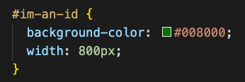 IDs, like other styling rules, must be declared in your stylesheet. They are denoted by the # symbol. Here is an example of an ID that makes an element's background-colour green and width 800px: